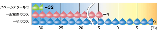 結露の発生する外気温度を各種ガラスで比べてみてください。スペーシアクール守の強さがはっきりとわかります。 |