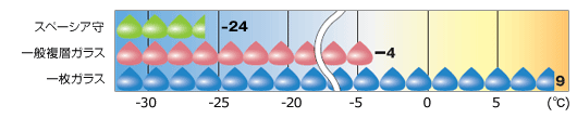 。 結露の発生する外気温度を各種ガラスで比べてみてください。スペーシア守の強さがはっきりとわかります。 |
